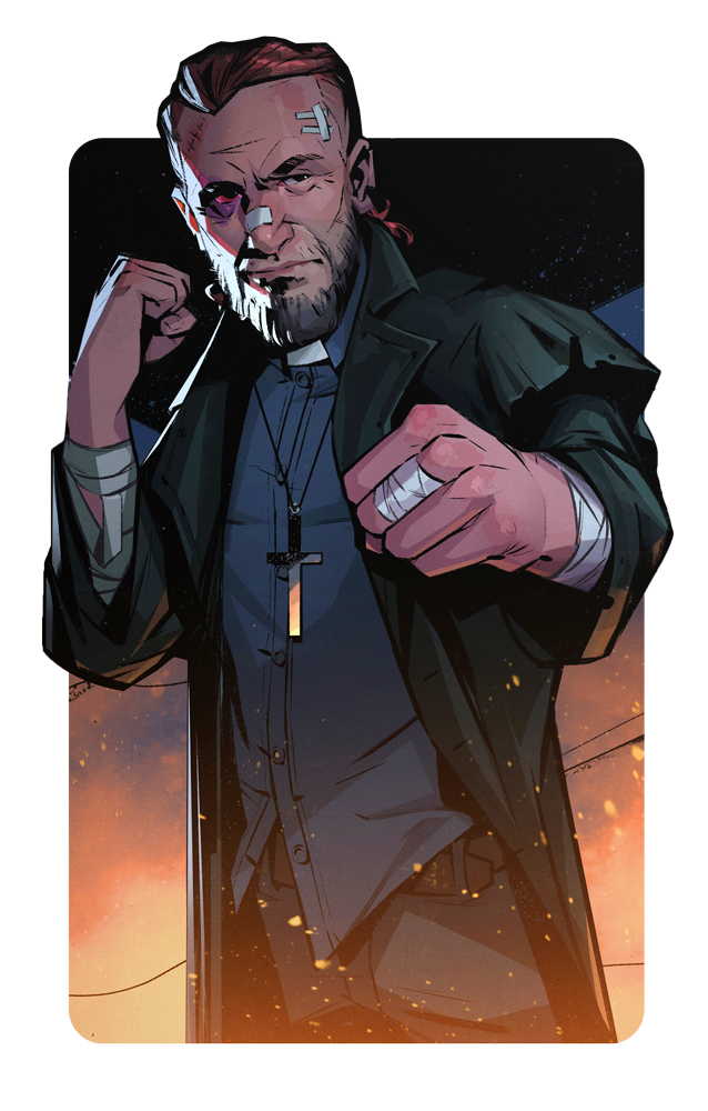 Job took the cloth after losing his family and fortune to the criminal underworld in a quick Crash and Burn that had him yelling “Devil, Devil, Take It All...“, after awakening and coming to the realization that just like his biblical counterpart, he is at the center of a bet between God and the Devil. Not long after his traumatic downfall, genuinely kind and affable Job employed his whole-hearted compassion to become a Father Figure and role model for the youth of Miller’s Square. And yet, Job is still a Man on a Mission, using his influence in the crime-ridden community to make contacts, working his way through the lower ranks of the mob to find those who killed his family.