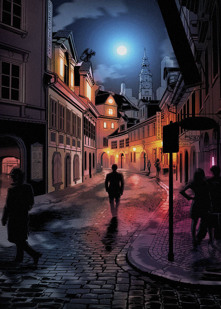 The Cobbled Street - Possibly the first paved street in the City, this narrow street has been renovated countless times, but has kept its historical look all the same. Mysterious street performers perform magical tricks that defy logic while musicians play long-forgotten tunes. At night this street takes on an otherworldly appearance. Mist creeps in and coils around the lampposts and silence washes over, seemingly covering the entire quarter, except for the faraway sounds of medieval music. Few walk about, their footsteps muffled and their figures dark and blurry. You get a feeling that something could emerge out of the night and spirit you away to another place, another life, and no one would ever know.
