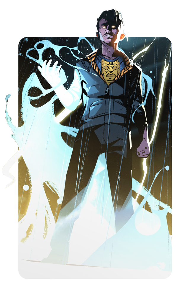Tlaloc is a two-bit crook who can talk his way out of anything, a Wheeler & Dealer from Miller’s Square’s seedy underbelly who fancies himself a big fish. However, deep down inside he has a heart of gold which makes him A Diamond in the Rough. He never meant to be helping anyone but himself... but then he awakened to the Mythos of Tlaloc, the Aztec God of Rain and Lightning. His newfound powers enable him to call upon storms and manipulate or even become water - “Wherever There is Water, There I Am”. However, he has found that his newly-gained powers also come with a call to protect the City.